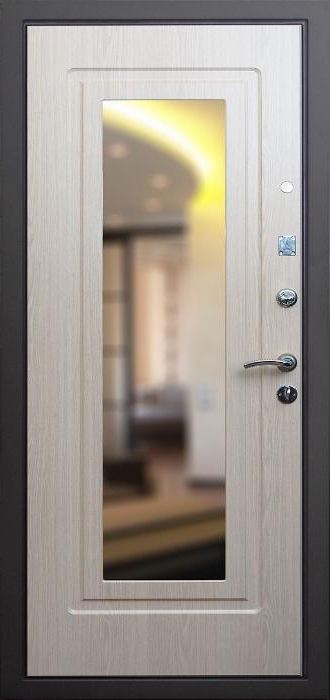 Эта модель создана для тех, кто ценит не только прочность, но и практичность в повседневном использовании. Стальной каркас из профильной трубы и лист металла толщиной 2 мм с рёбрами жёсткости формируют надёжную основу, способную выдерживать серьёзные нагрузки. Снаружи дверь защищена порошковым покрытием, которое устойчиво к влаге, солнцу и механическим повреждениям, а изнутри отделана МДФ-накладкой, придающей интерьеру уют и аккуратность. В центре конструкции внимание привлекает зеркало — удобная деталь, которая избавляет от необходимости в дополнительном настенном аксессуаре и одновременно делает пространство визуально просторнее. Именно здесь название модели — металлическая дверь с зеркалом в дом №2 — обретает своё значение, сочетая функциональность с эстетикой. Для повышения безопасности предусмотрены два замка российского производства с независимыми системами запирания, а также блокираторы. Два контура уплотнителя защищают от сквозняков и пыли, а возможность выбрать направление открывания делает установку универсальной. Металлическая дверь с зеркалом в дом №2 от производителя: быстрое изготовление и монтаж в Протвино, индивидуальные размеры, широкий выбор материалов и фурнитуры, официальная гарантия до 10 лет.