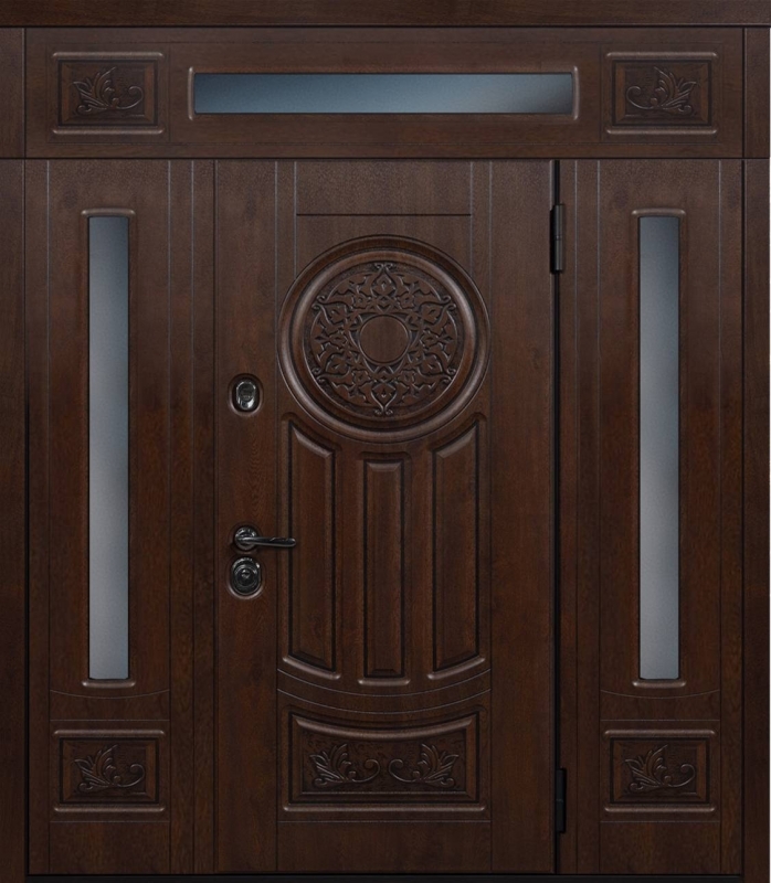 Эта нестандартная парадная дверь с фрамугой №6 — отличный выбор для тех, кто ценит элегантность и долговечность. Внешняя и внутренняя отделка из МДФ придает дверям стильный и современный вид, а также защиту от механических повреждений. МДФ устойчива к царапинам и вмятинам, что делает дверь идеальной для долгосрочной эксплуатации. Каркас из профильной трубы 50х25 мм и лист металла толщиной 2 мм обеспечивают прочность и надежность, а ребра жесткости из профильных труб гарантируют дополнительную устойчивость. В двери установлены блокираторы, два контура уплотнителей из резины, что повышает звуко- и теплоизоляцию. Замки от известных производителей, таких как Просам и Мосрентген, обеспечат надежную защиту. Возможность комбинировать отделку, добавлять зеркало, стеклопакет или кованые элементы позволяет легко адаптировать дверь под любые предпочтения. Нестандартная парадная дверь с фрамугой №6 от производителя: быстрое изготовление и монтаж в Протвино, индивидуальные размеры, широкий выбор материалов и фурнитуры, официальная гарантия до 10 лет.