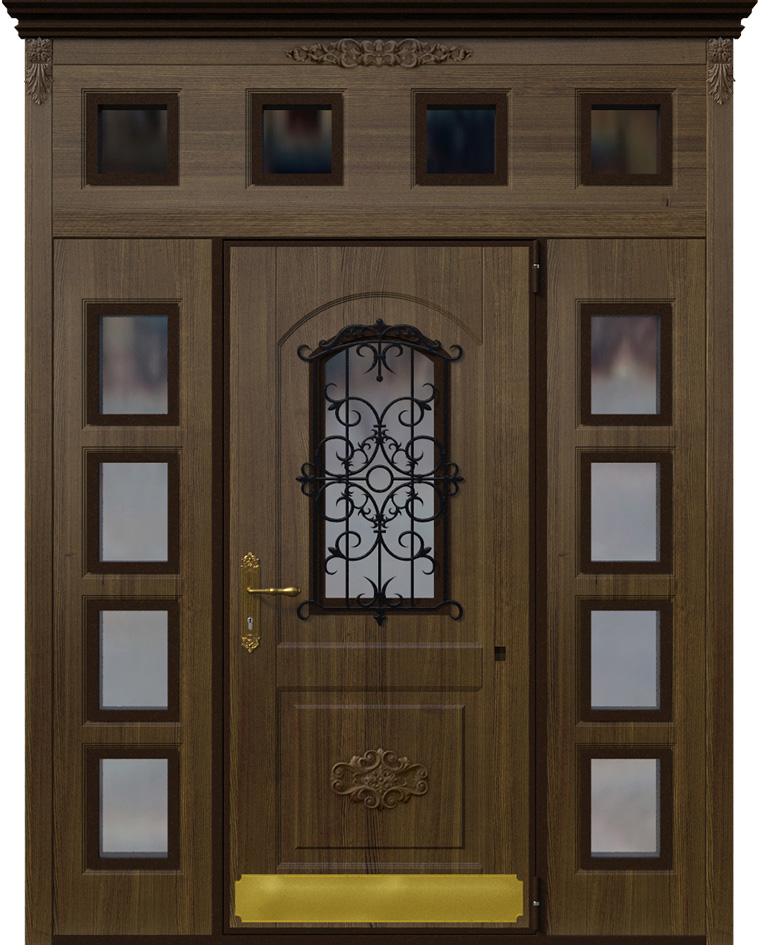 Эта модель выделяется своим масштабом и декоративностью: двухстворчатая дверь со вставками и ковкой №2 подчеркивает парадность входа и придает фасаду респектабельность. Основу составляет прочный каркас из стальных профильных труб с листом металла толщиной 2 мм и ребрами жесткости, что обеспечивает долговечность и защиту. Снаружи и внутри полотно облицовано накладками МДФ, которые позволяют воплотить различные варианты текстур и оттенков, сохраняя устойчивость к механическим повреждениям и влиянию внешней среды. Кованые элементы вносят в образ двери нотку изысканности и индивидуальности, делая ее центральным акцентом всего фасада. Для безопасности предусмотрены два замка турецкого производителя Kale Kilit — цилиндровый и сувальдный, каждый с ригелями, усиливающими защиту. Такая дверь сочетает надежность металлической конструкции с эстетикой классического дизайна, превращая вход в настоящий архитектурный акцент. Двухстворчатая дверь со вставками и ковкой №2 от производителя: быстрое изготовление и монтаж в Протвино, индивидуальные размеры, широкий выбор материалов и фурнитуры, официальная гарантия до 10 лет.