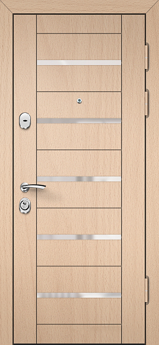 Эта бронированная дверь в современном дизайне №28 станет отличным решением для частного дома, квартиры или офиса, предлагая надежную защиту и стильный внешний вид. Ее конструкция включает каркас из профильной трубы 50х25 мм и металлическое полотно толщиной 2 мм, что обеспечивает прочность и долговечность. Внешняя и внутренняя отделка выполнены из плиты МДФ, придающей двери современный вид и стойкость к механическим повреждениям. Хотя терморазрыв отсутствует, конструкция с терморазрывом коробки и полотна помогает снижать теплопотери. Дополнительную безопасность обеспечивают два замка — сувальдный и цилиндровый, оба с тремя ригелями. В дверь можно добавить зеркало, стеклопакет или кованые элементы, а также установить видеодомофон, что делает эту модель максимально универсальной и индивидуальной. Бронированная дверь в современном дизайне №28 от производителя: быстрое изготовление и монтаж в Протвино, индивидуальные размеры, широкий выбор материалов и фурнитуры, официальная гарантия до 10 лет.